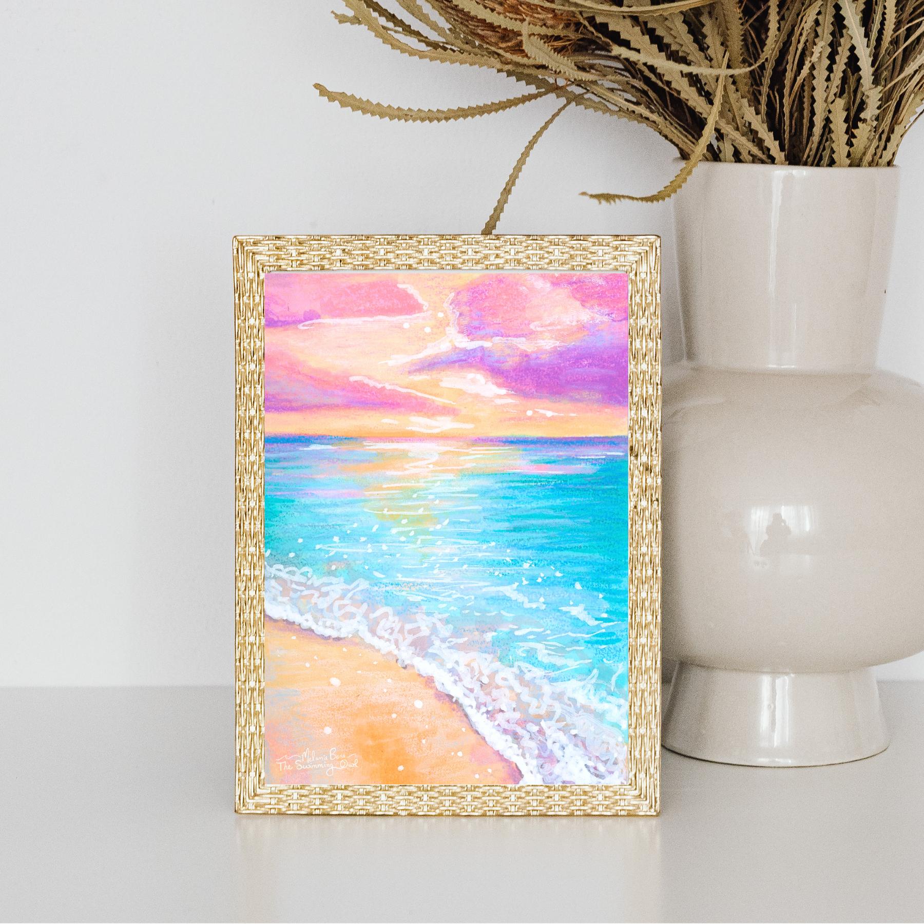 Inspired by my time living in Akumal, Mexico, many moons ago, this watercolor art print features gentle turquoise waves meeting the shore under a dreamy pink and peach sky, capturing that magical moment at the end of a relaxing seaside day. I could almost hear the gentle crash of the waves as I painted this scene.